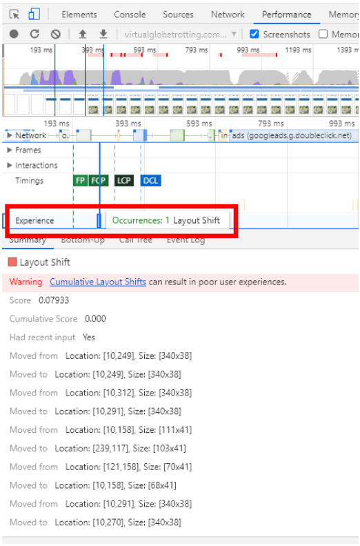 Если вы нажмете на кнопку View Original Trace в разделе Аудит, откроется вкладка Perfomance. На вкладке Perfomance теперь есть новый столбец Experience, в котором на временной шкале отображаются отдельные смещения разметки и данные о них.